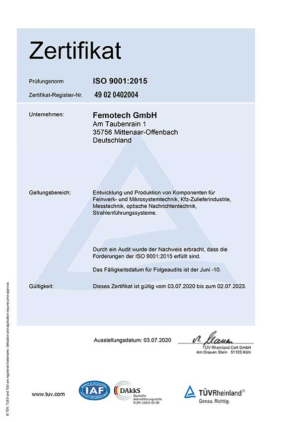 Die FEMOTECH GmbH ist seit 2008 ISO 9001 zertifiziert.